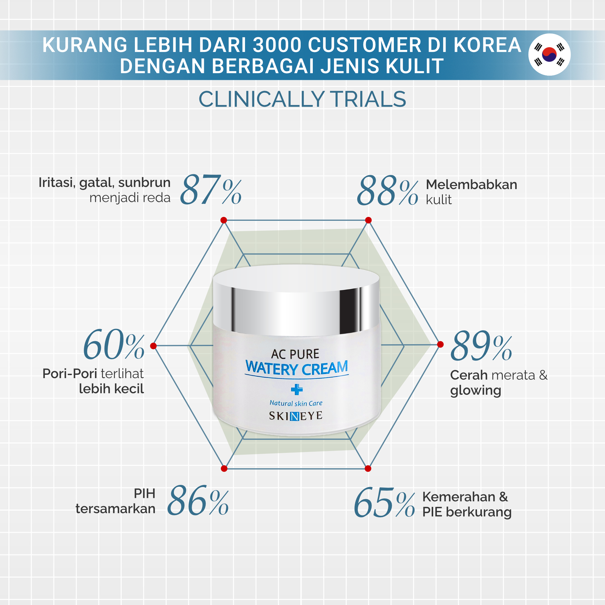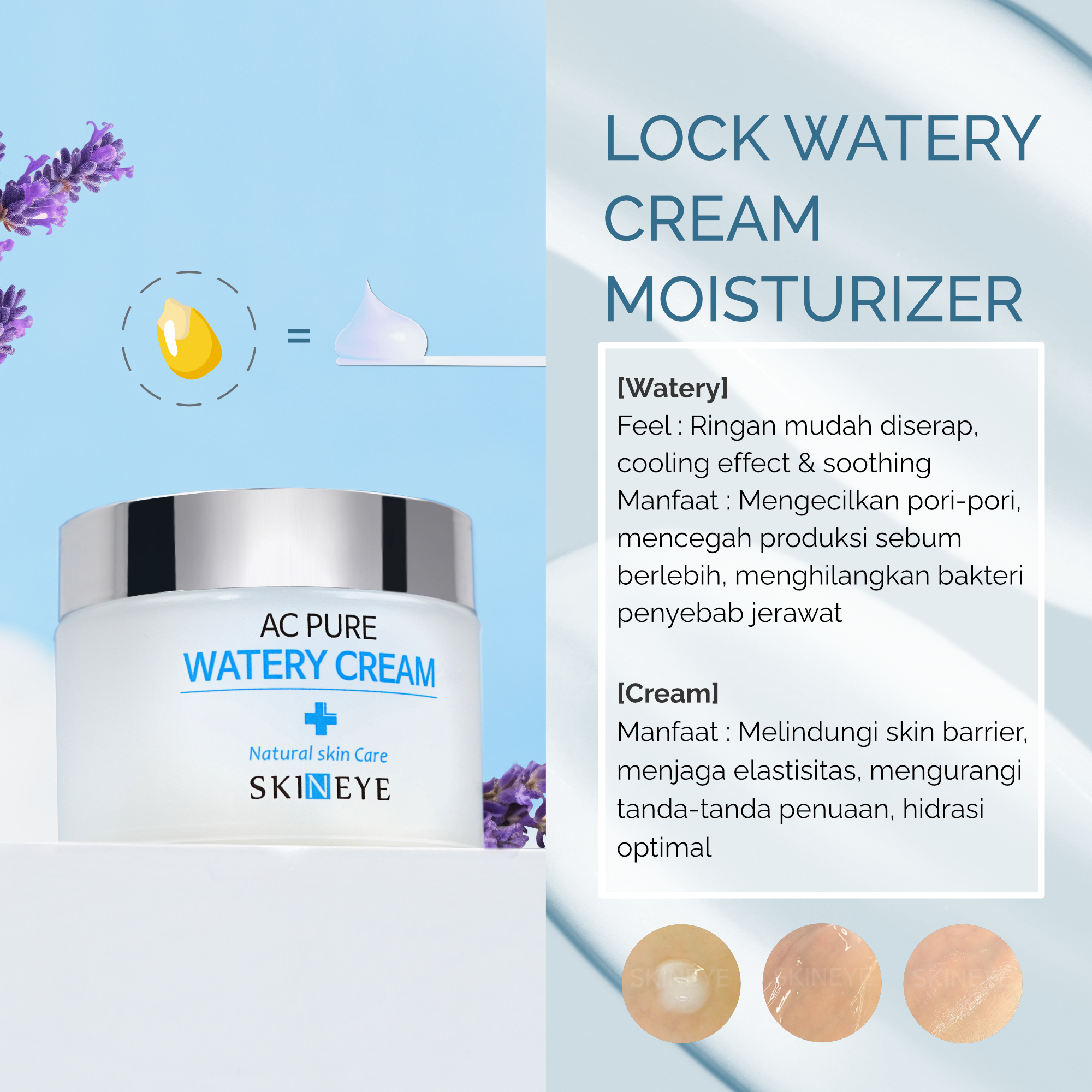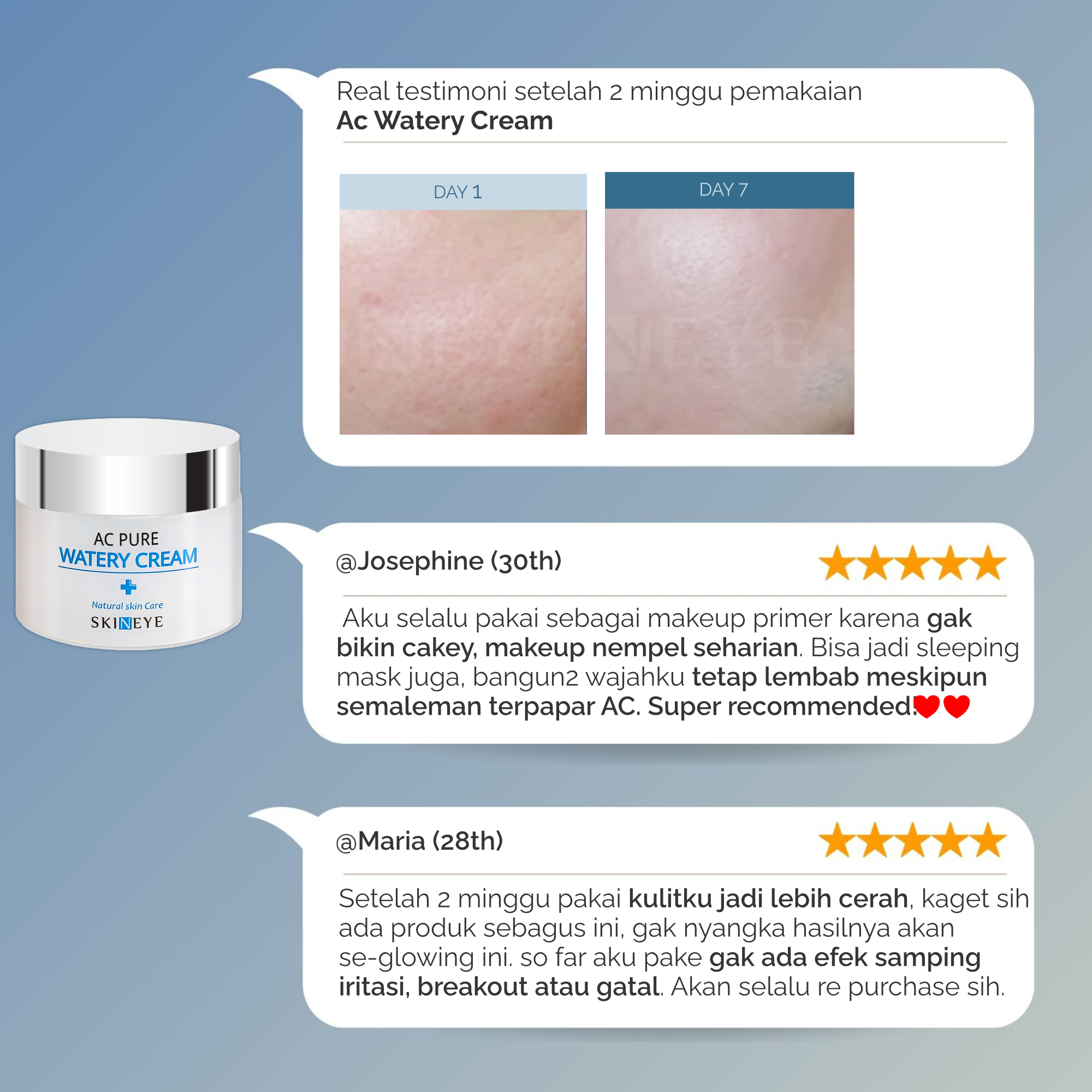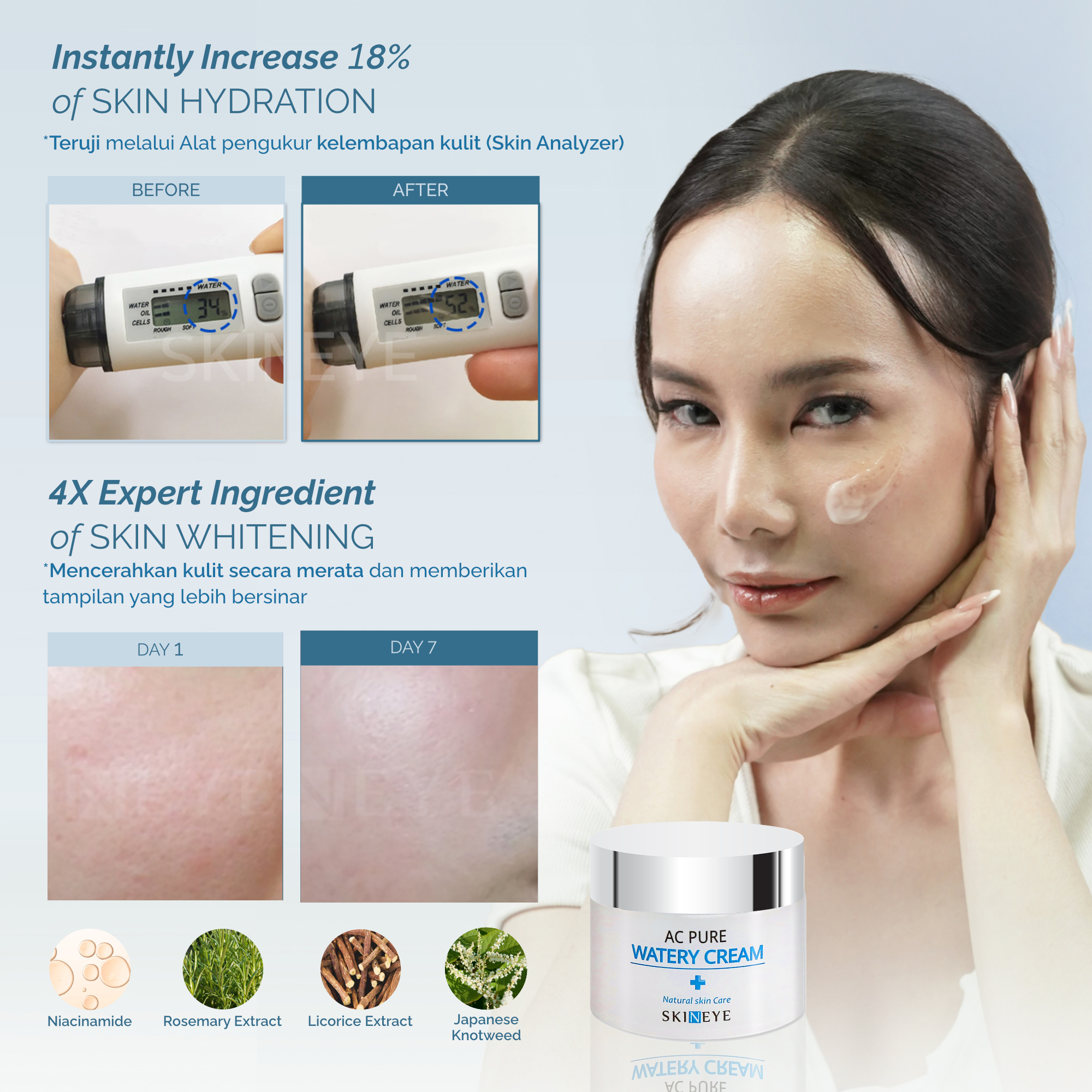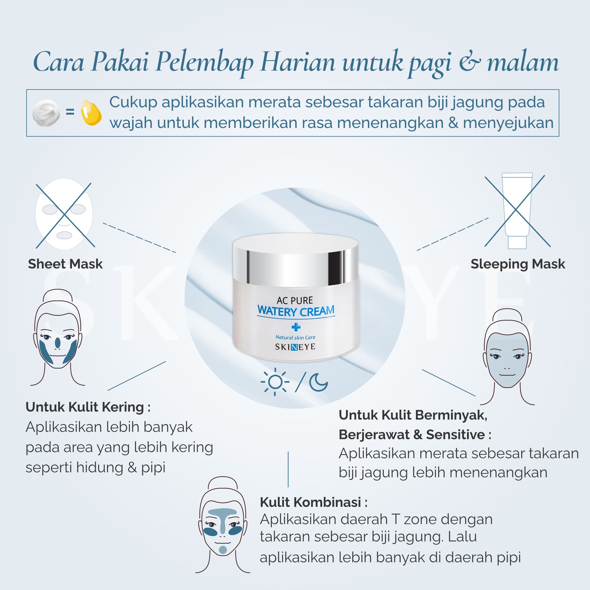 Cara pakai : Setelah mencuci muka dengan AC Pure Cleansing Foam, aplikasikan AC Pure Watery cream pada kulit wajah sebesar biji jagung. Lalu pijat secara perlahan agar kulit wajah terasa nyaman.