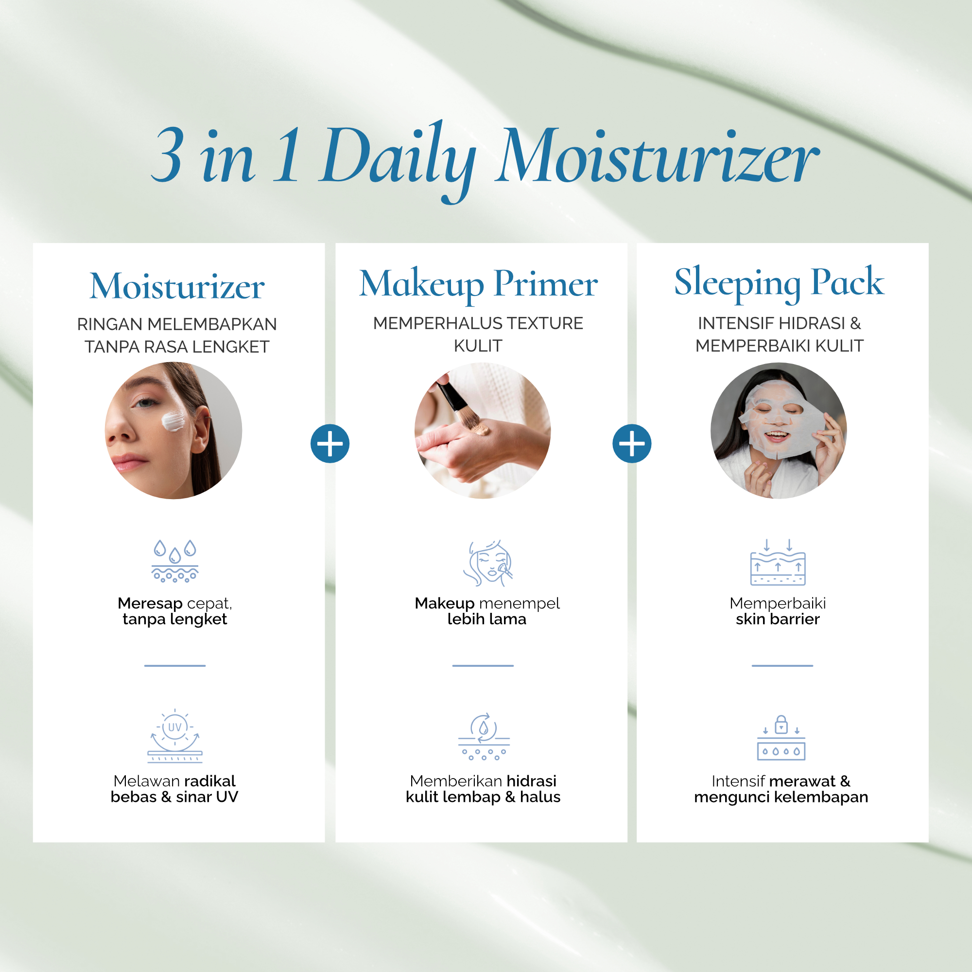 Moisturizer yang dapat mengunci dan menyeimbangkan kadar air dalam kulit efektif hingga 72 jam. Memberikan hidrasi mendalam, membantu menjaga keseimbangan hidrasi kulit. Dapat meredakan iritasi kemerahan dalam 5 menit karena memiliki kandungan alami dari ekstrak portulaca oleracea untuk meredakan kemerahan, hingga peradangan dalam kulit. Perlindungan alami sebelum beraktivitas di pagi hari dan malam hari sebelum beristirahat. Terbukti +86% menghidrasi kulit +65% meredakan kemerahan pada jerawat +52% perawatan pori-pori dan sebum +87% menengkan kulit wajah. Texturnya yang ringan dan mudah menyerap akan memberikan sensasi segar setelah pemakaian, menyerap tanpa meninggalkan rasa lengket atau berat pada kulit. Sangat cocok digunakan di daerah tropis dan subtropis. Keseimbangan yang sempurna untuk semua jenis kulit. Dapat digunakan sebagai moisturizer dan juga makeup primer. Produk yang berhasil menggabungkan bahan-bahan alami dan medical grade yang aman, efektif, dan halus untuk semua kondisi kulit. Telah terdaftar dan dilindungi oleh paten di korea patented technology in korea.